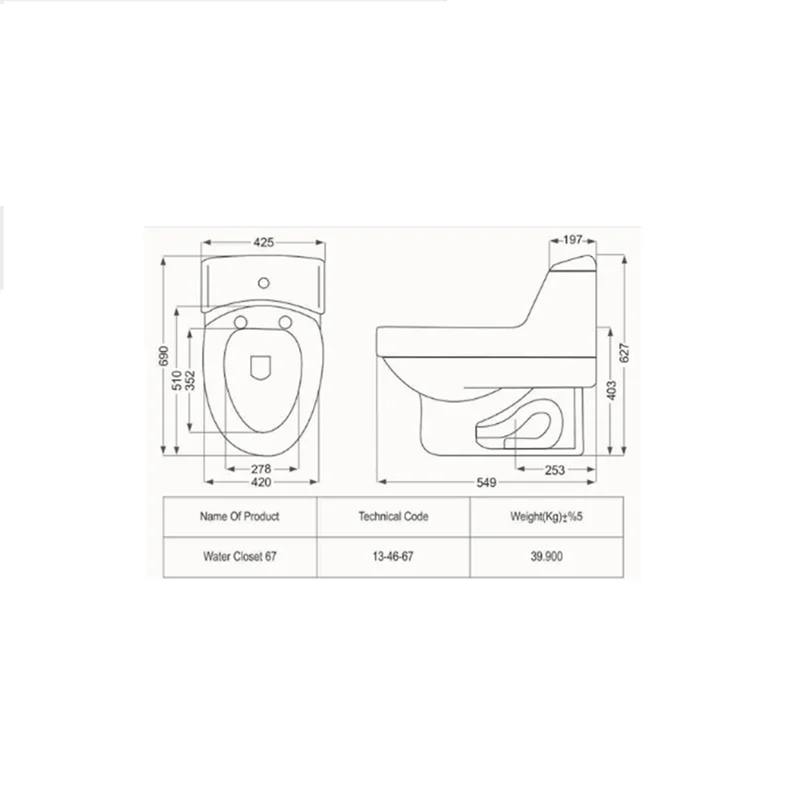 این توالت فرنگی دارای سیستم تخلیه واترجت و تخلیه سریع است. خروجی این توالت به کف می باشد. سایز این محصول ۶۷ می باشد. ابعاد آن ، ۶۲٫۷*۴۲٫۵*۶۹ سانتی متر و وزن آن ، ۳۹٫۹ کیلوگرم می باشد. آکس این محصول ۲۵٫۳ سانتی متر است. این توالت فرنگی مروارید در سه درجه تولید می گردد.