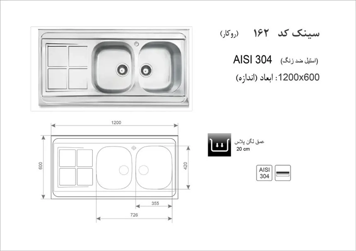 سینک اخوان مدل 162 از انواع سینک روکار محسوب میشود. نمای سینک استیل شده است. ابعاد سینک 60*120 سانتیمتر است که شکل فانتزی بودن لگن زیبایی منحصر به فردی برای این سینک رقم زده است. این سینک از انواع عمیق به شمار میرود. سینک روکار اخوان مدل 162 دارای دو لگن و یک سینی است که برای قرار دادن وسایل مناسب خواهد بود.