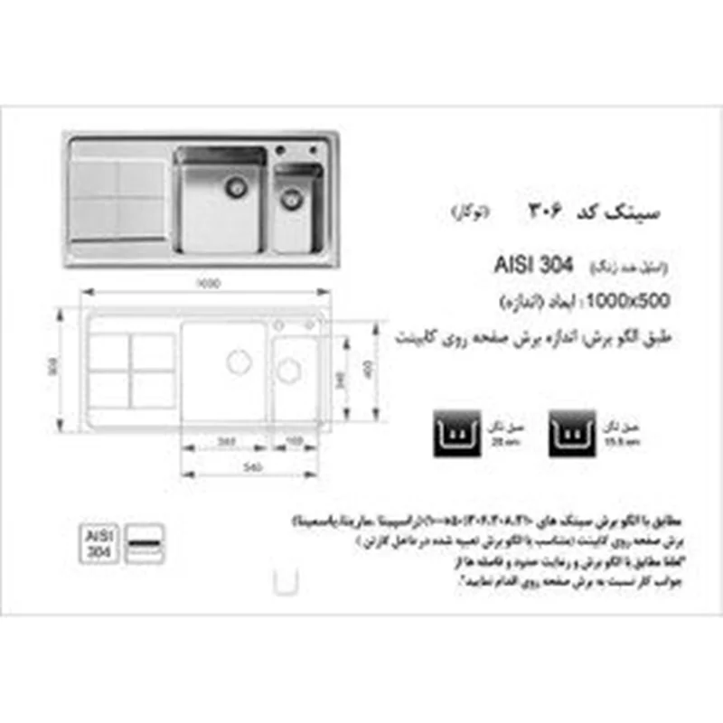 سینک اخوان مدل 306 از انواع سینک توکار محسوب میشود و در دسته سینکهای باکسی قرار میگیرد. نمای سینک استیل شده است. ابعاد سینک 50*100 سانتیمتر است. این سینک از انواع عمیق به شمار میرود. سینک توکار اخوان مدل 306 دارای یک لگن و یک سینی است که برای قرار دادن وسایل مناسب خواهد بود. از لوازم جانبی این سینک میتوان به سیفون و زیرآب اشاره کرد. سیفون ظرفشویی در بسیاری از سینکها جزو لوازم جانبی به حساب میآید. این وسیله در زیر سینک ظرفشویی نصب شده و کاربرد آن خارج کردن آب به سمت فاضلاب میباشد. همچنین این سینک دارای یک میوه شور است.