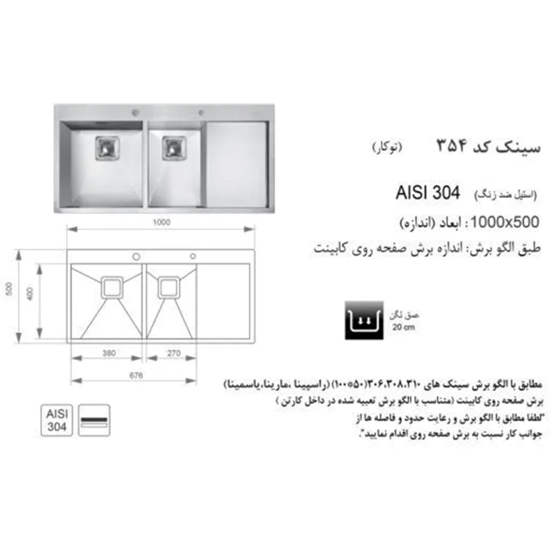 سینک اخوان مدل 354 از انواع سینک توکار محسوب میشود و در دسته سینکهای باکسی قرار میگیرد. نمای سینک استیل شده است. ابعاد سینک 50*100 سانتیمتر است. این سینک از انواع عمیق به شمار میرود. سینک توکار اخوان مدل 354 دارای دو لگن و یک سینی است که برای قرار دادن وسایل مناسب خواهد بود. از لوازم جانبی این سینک میتوان به سیفون و زیرآب اشاره کرد. سیفون ظرفشویی در بسیاری از سینکها جزو لوازم جانبی به حساب میآید. این وسیله در زیر سینک ظرفشویی نصب شده و کاربرد آن خارج کردن آب به سمت فاضلاب میباشد.