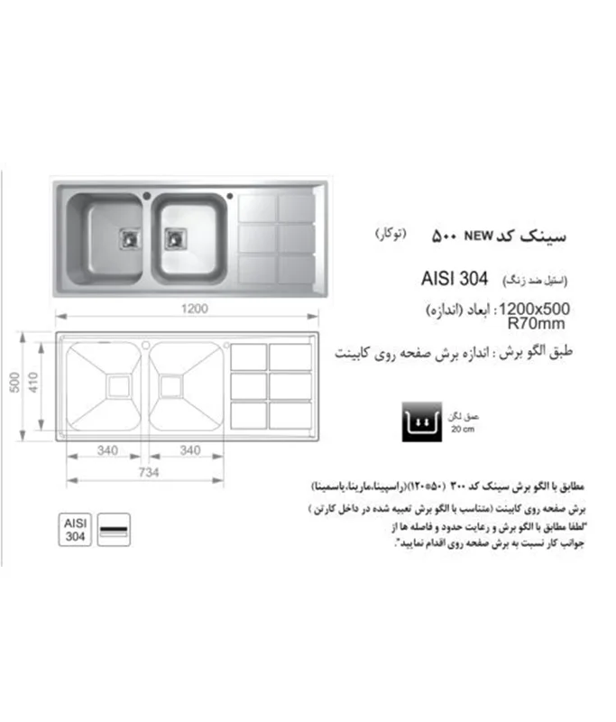 سینک اخوان مدل 500 از انواع سینک توکار محسوب میشود و در دسته سینکهای باکسی قرار میگیرد. نمای سینک استیل شده است. ابعاد سینک 50*120 سانتیمتر است. این سینک از انواع عمیق به شمار میرود. سینک توکار اخوان مدل 500 دارای دو لگن و یک سینی است که برای قرار دادن وسایل مناسب خواهد بود. از لوازم جانبی این سینک میتوان به سیفون و زیرآب اشاره کرد. سیفون ظرفشویی در بسیاری از سینکها جزو لوازم جانبی به حساب میآید. این وسیله در زیر سینک ظرفشویی نصب شده و کاربرد آن خارج کردن آب به سمت فاضلاب میباشد.